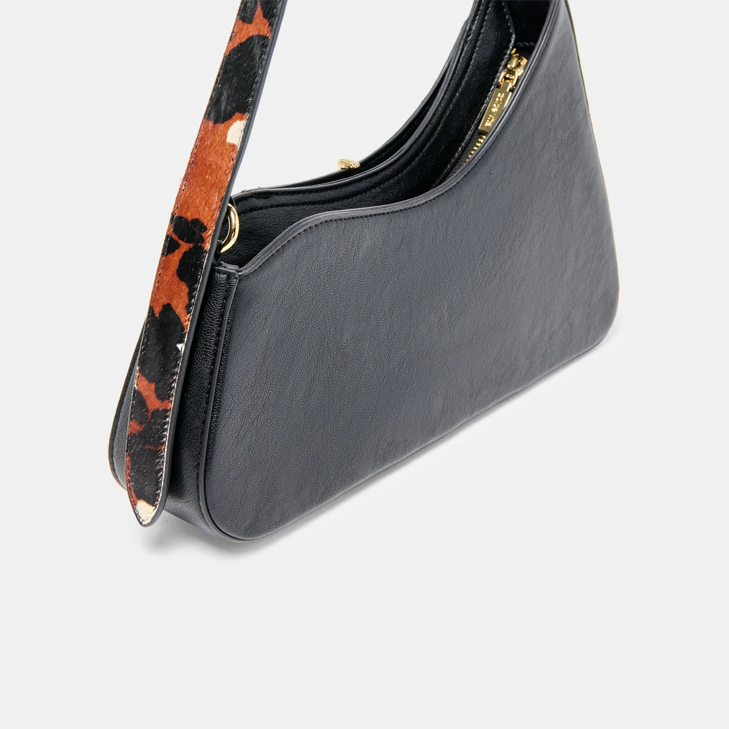 PRYA blends on-trend details with timeless sophistication. This shoulder bag’s asymmetrical silhouette is effortlessly cool and perfectly understated while her removable gold hangoff charm adds a little extra interest. Bold animal print in calf hair texture makes for a statement bag that goes with everything.